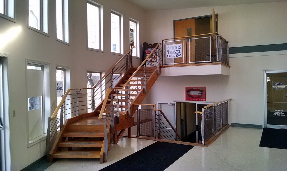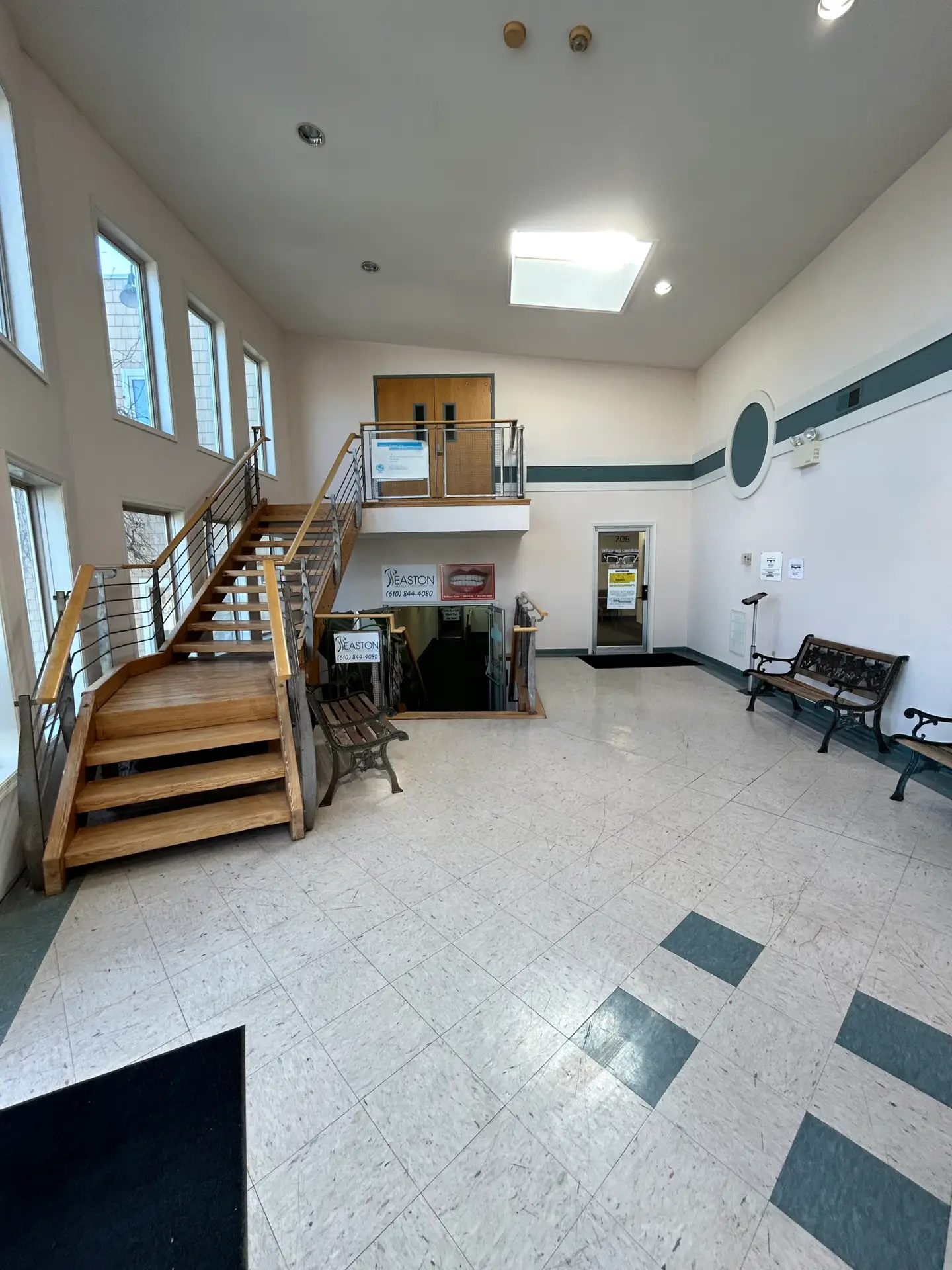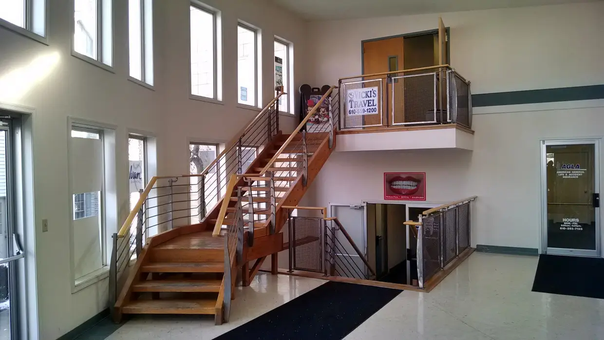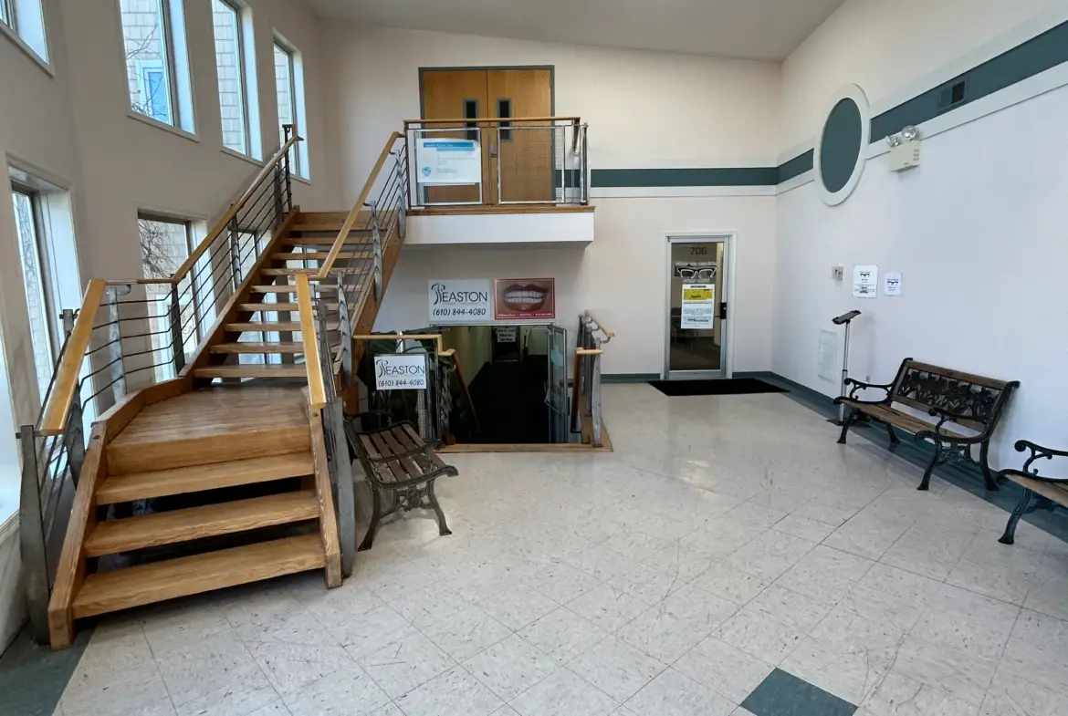 This building is part of a commercial complex that was restored from historic farm buildings and houses. This +/- 1,425 SF office space features six small offices, common area restrooms, and three-phase electricity. Office is located on the second level. Plaza also features ample parking throughout for 150 vehicles. Join Easton Family Chiropractic, William Penn Family Dental, and Palmer Optical. Schedule a showing today!!! Convenient access to Route 33, I-78 and Route 22. Pylon signage available. Space would be a great use for telemarketing company, spa, yoga studio or recruitment office. Located on heavily traveled William Penn Highway in Palmer Township (Easton), PA.